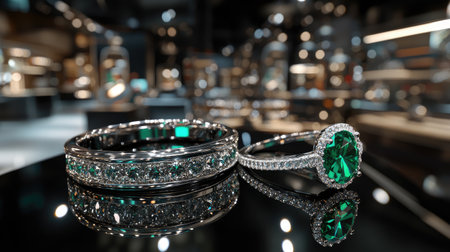 A captivating display of elegant green gemstone rings and bangles in a stylish jewelry store, showcasing intricate designs and high-quality craftsmanship.