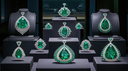 This stunning display features a variety of emerald and diamond jewelry pieces, showcasing elegance and luxury. The intricate designs captivate attention, offering a glimpse into high-end fashion and craftsmanship.