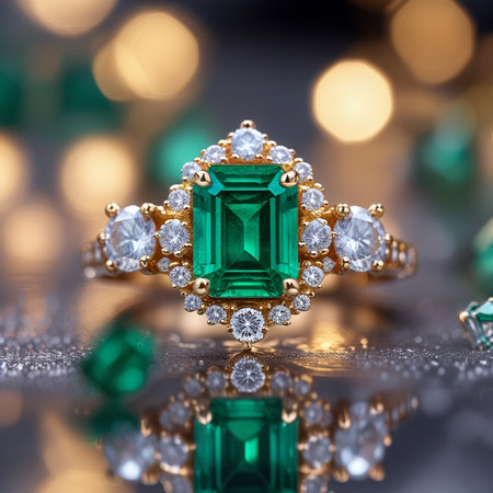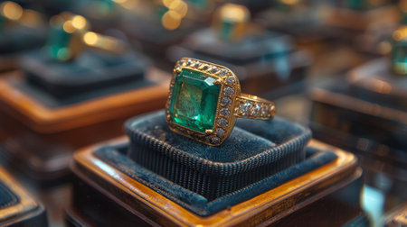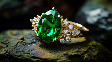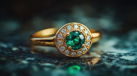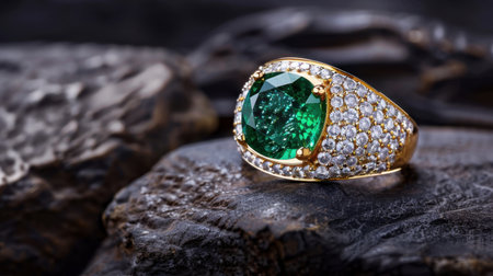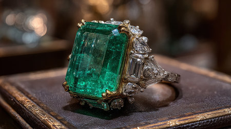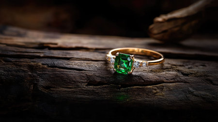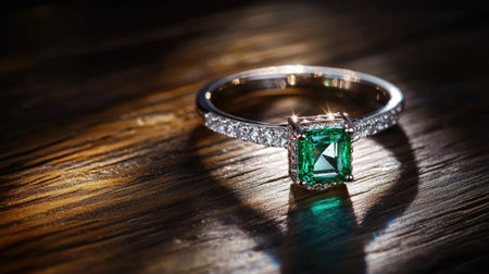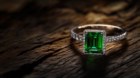 A stunning emerald ring embellished with sparkling diamonds, resting gracefully on a wooden surface, illuminated by soft natural light, creating an exquisite aura.