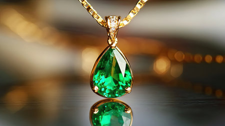 This stunning green gemstone pendant necklace showcases a pear-shaped design and a shiny gold chain, all set against a beautiful backdrop.