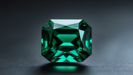 Emerald gemstones are showcased in this image, illuminated against a dark backdrop. The visual characteristics include a rich green color, with each stone presenting a multifaceted structure and reflective qualities. The lighting suggests an indoor setting, and the composition is suitable for editorial or commercial applications.