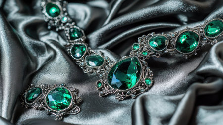 This captivating image features exquisite green gemstone jewelry set against a silky fabric backdrop, highlighting intricate details and luxurious design.