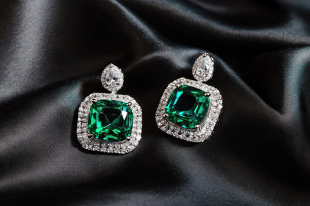 Elegant emerald and diamond earrings resting on luxurious black silk, symbolizing beauty, wealth, and timeless style.
