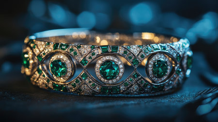 Close-up of an elegant bracelet featuring exquisite emeralds and diamonds, showcasing intricate design details. Perfect for luxury fashion enthusiasts.