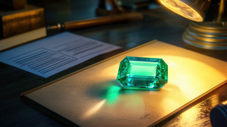 A striking emerald gemstone lies on a wooden desk, beautifully illuminated by warm light. The image captures the gem's clarity and rich green hue, creating a serene atmosphere.
