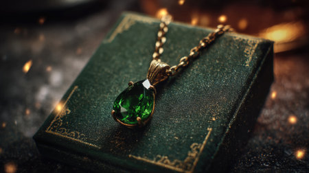 This stunning vintage green gemstone pendant is elegantly displayed on a luxurious textured jewelry box, radiating beauty and sophistication in warm ambient light.