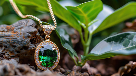 This stunning close-up image showcases an elegant green gemstone necklace adorned with sparkling details, highlighted against lush foliage.
