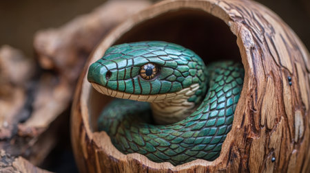 Mystical green wooden snake with glowing eyes, creating a sense of mystery.