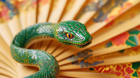 Intricately detailed green snake on an ornate fan, representing Chinese New Year 2025.