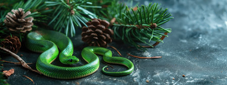 Close-up of a green snake with pine branches and cones. Symbol of the 2025 Chinese New Year