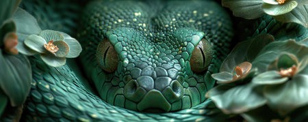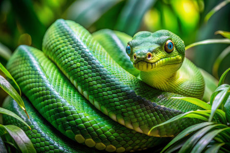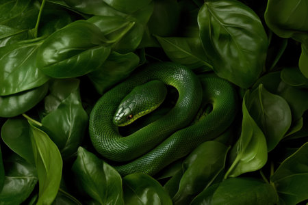 A green snake coiled among lush green leaves, blending seamlessly with its surroundings. The vivid green colors and the snake's intricate scales create a striking and captivating visual.