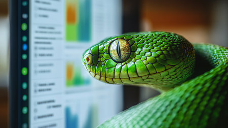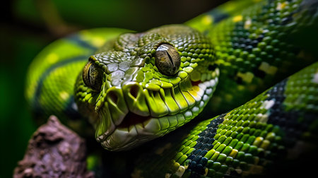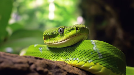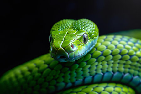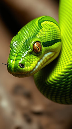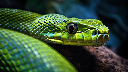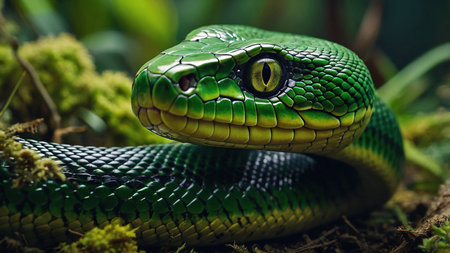 Vibrant green snake showcasing intricate scales and striking eyes in natural habitat