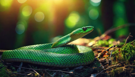 Close-Up Of A Vibrant Green And Yellow Snake s Head With Shimmering Bokeh, Wildlife Portrait