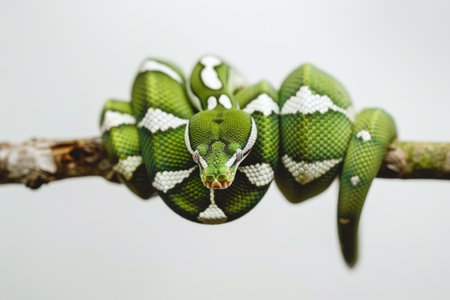 Emerald Tree Boa is coiled comfortably on a branch showcasing its striking bright green scales and distinctive white stripes in a high key setting.