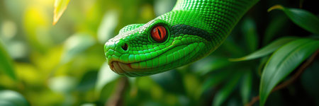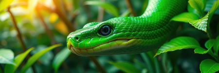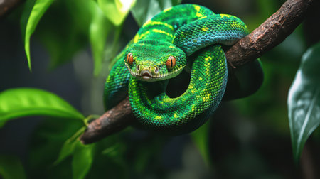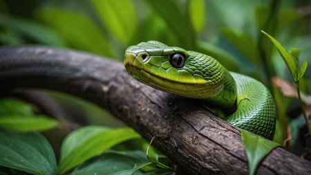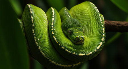 A vibrant green snake curled around a branch amidst lush foliage. Its striking colors and patterns are captivating and vivid.