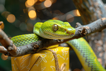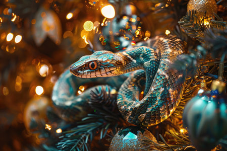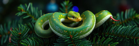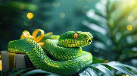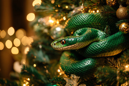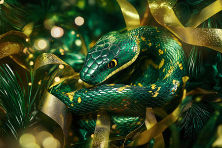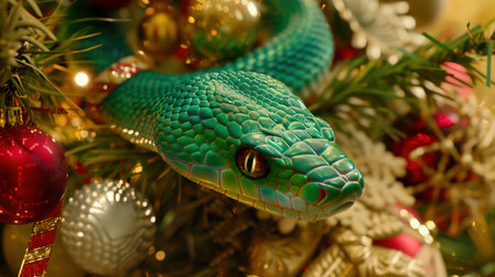 Green snake is nestled amidst festive ribbons and sparkling lights, creating a captivating scene