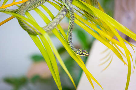 Chrysopelea ornata on a branch is a snake with a slender body. Green-yellow scales, black stripes