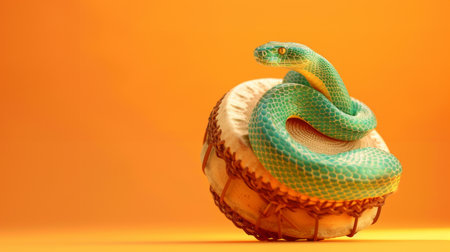 Ethnic drum set against an orange background, with a vibrant green viper coiled around it, exuding danger and exoticism with its glistening scales