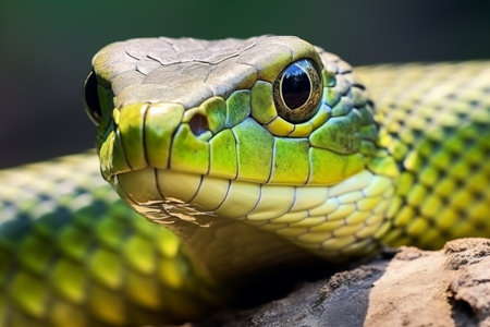 Intense Close-up: Green Snake Head with Textured Scales and Piercing Eyes