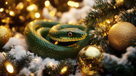 A green snake is elegantly coiled amid shimmering golden ornaments and festive greenery, capturing the essence of holiday cheer.