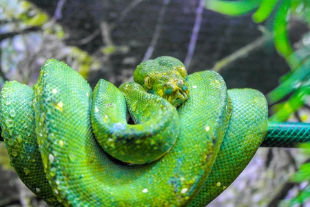 red tailed green snake ratsnake with its face in closeup, tropical reptile specie from Asia