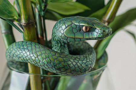 Green wooden snake coils around a bamboo plant in a glass vase, showing intricate details and adding a touch of nature to home decor