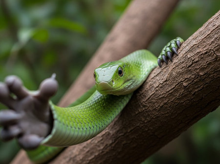 Green python gracefully resting on a branch in a lush environment during the daytime