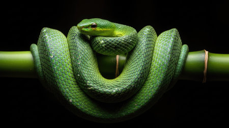 A vibrant green snake is wrapped around a bamboo stalk, captured against a stark black backdrop. The image displays the reptile's textured skin and the smooth, cylindrical form of the bamboo. The composition uses natural light to highlight the colors. Suitable for various editorial and commercial projects.