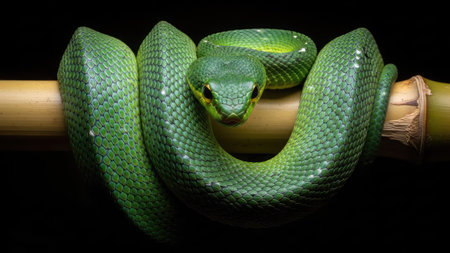 A striking green snake is coiled around a light brown bamboo branch, captured against a stark black backdrop. Its textured scales and piercing gaze are highlighted by the overhead lighting. The composition suggests a focused view of the snake, suitable for various editorial and commercial applications. The image showcases the beauty of nature.