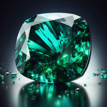 Emerald on a reflective surface. Shallow depth of field. generative ai