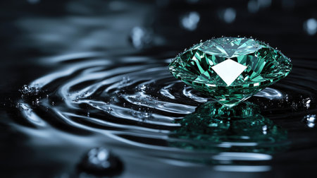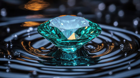 Close-up image of a teal colored diamond resting on a surface of rippling water. The diamond is highly detailed and its facets are clearly visible. The water ripples display reflections of the light and the diamond. The background is a dark surface.