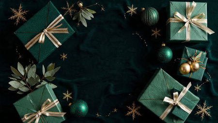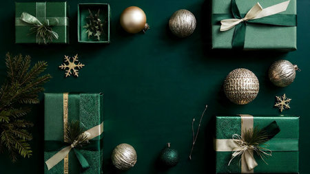 A smooth matte green surface bordered by premium wrapped presents and metallic silver ornaments.