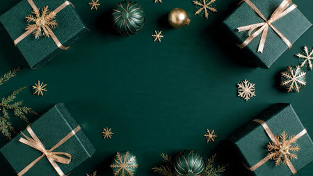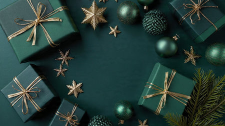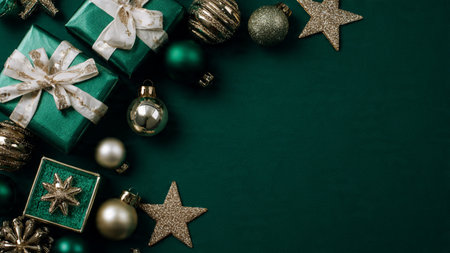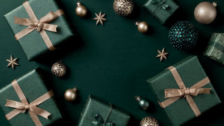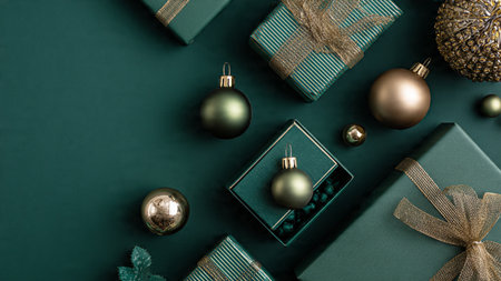 Christmas or New Year flat lay top view Xmas holiday celebration decorative composition with green gift boxes and golden balls on dark green background copy space