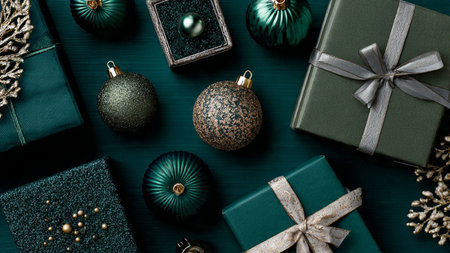 Elegant festive flat-lay using emerald Christmas ornaments and soft gold lighting.