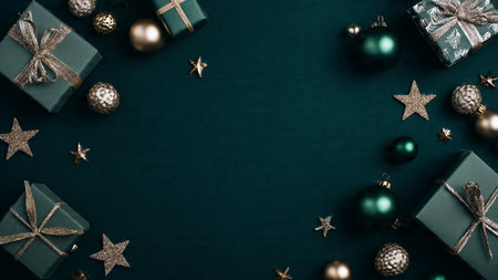 Christmas background with gift boxes and decorations on dark green background, top view
