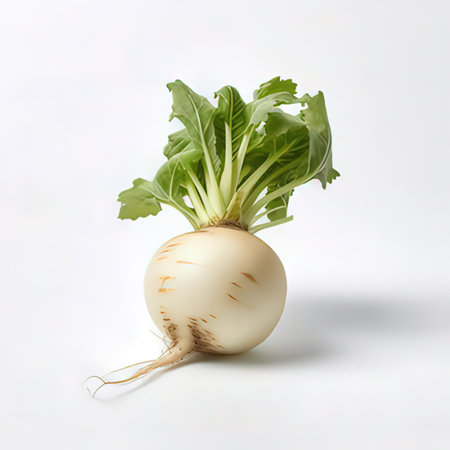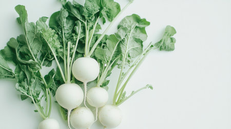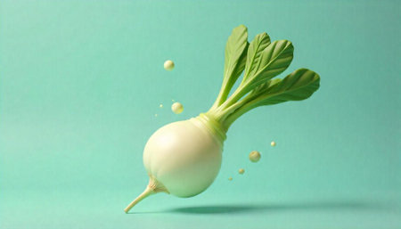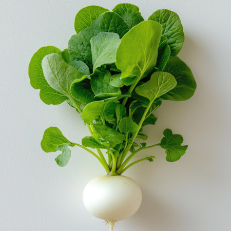 Discover the beauty of a fresh white radish with vibrant green leaves, perfect for enhancing culinary dishes and healthy diets.