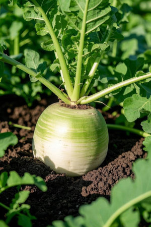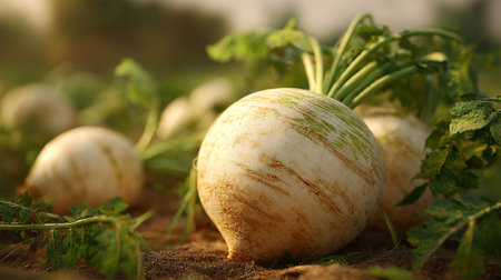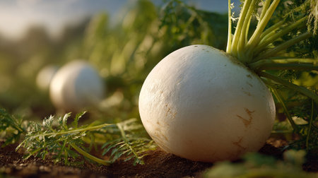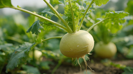 Fresh White Turnips Growing in Rich Soil, Ready to Harvest Soon