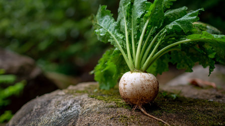 Fresh Turnip with Lush Green Leaves Resting on a Mossy Stone