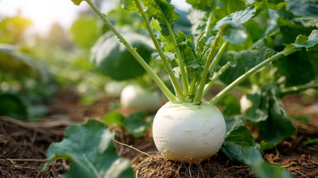 Fresh white turnips growing in the field with green leaves and sunshine.