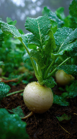 Organic farming scene with turnip plants growing in moist dark soil, focus on green leaves and roots