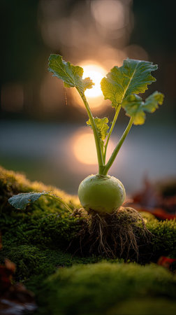 Photo of a young Kohlrabi growing on moss at sunrise, symbolizing hope and new beginnings.