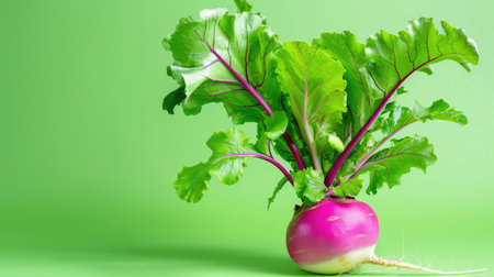 A vibrant composition featuring a fresh purple turnip surrounded by lush green leaves, set against a bright green background, symbolizing healthy eating and organic farming.