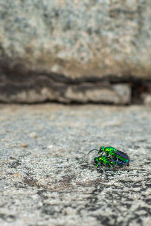 Belur, Karnataka, India - November 2, 2013: Chennakeshava Temple building. Closeup of Two jewel beetjes making love on gray stone.