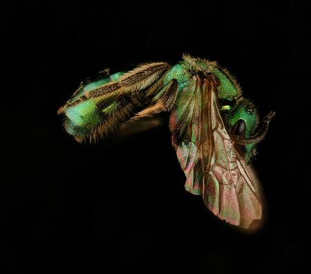 bee Macro specimen, Flying insect , side front back,A small but blingiful green bee.