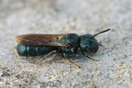 Detailed closeup on a female blue eyed small carpenter bee Ceratina cyanea sitting on a stone in Souther France