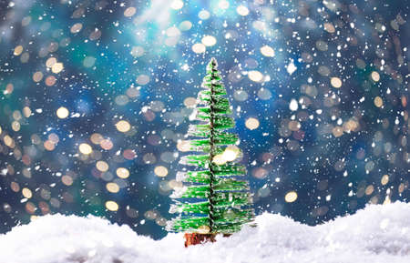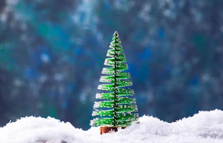 Little Christmas tree toys in snowdrift, winter New Year concept. Festive composition on blue background with lights and snowflakes