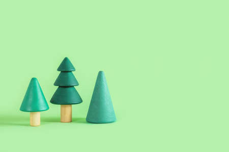 A minimalist Christmas display featuring small evergreen trees and pinecones dusted with artificial snow on a vibrant green background.