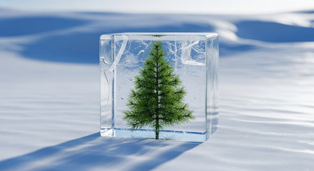 Christmas tree frozen in ice cube. 3D illustration. Winter background.