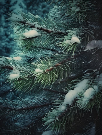 A macro perspective highlights the intricate details of a frosted evergreen branch, featuring vibrant green needles encased in clear ice and soft snow, evoking a serene cold season.