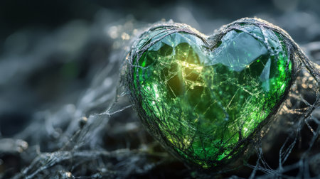 Heart of green gemstones in a network of fine cracks, light shining, renewal concept generative ai
